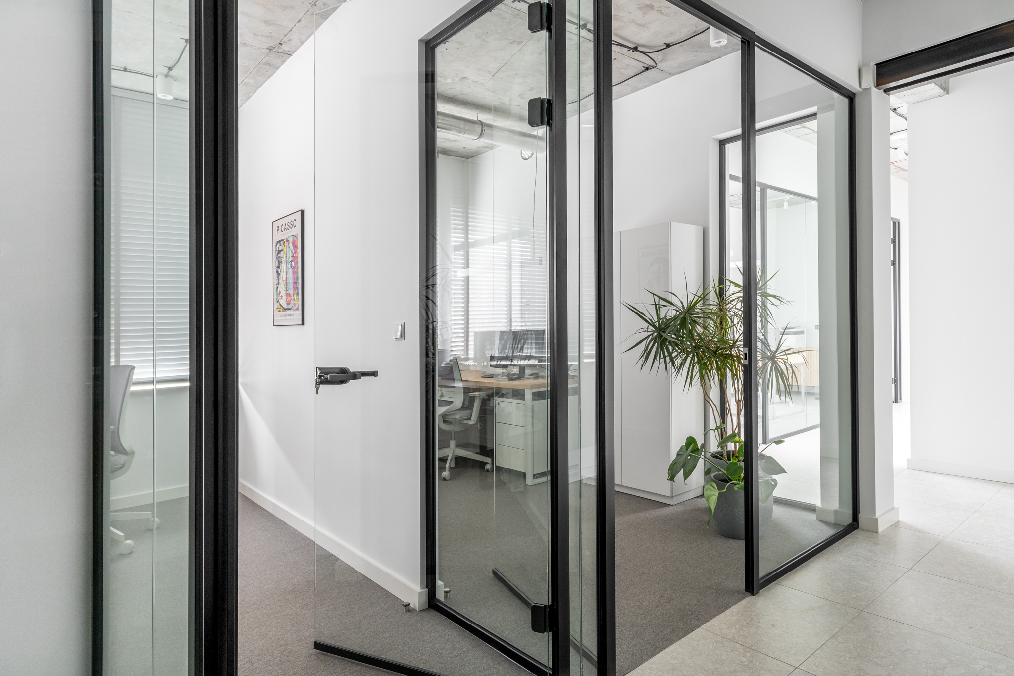 Z części holu wydzielony został dział księgowości. Duża liczba przeszkleń sprawia, że mimo niewielkiej przestrzeni, pomieszczenia wydają się przestronne, a całość wypełnia naturalne światło.