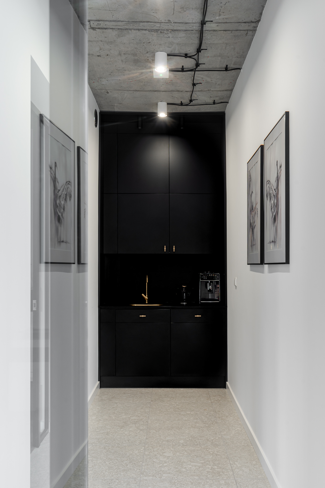 Z drugiej dostępnej przestrzeni zostały wydzielone cztery pomieszczenia: gabinety pracowników oraz założyciela firmy, a także serwerownia. Rewolucję przeszły toalety oraz aneks kuchenny, które, utrzymane w ciemnej kolorystyce, kontrastują z pozostałą częścią biura.